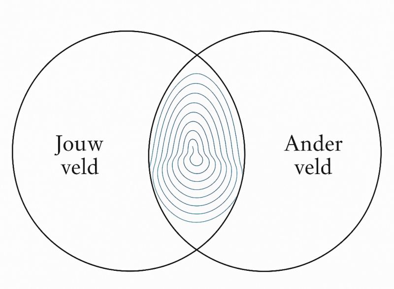 De afbeelding hierboven laat het mooi zien. Twee velden – jouw wereld en die van de ander – met een overlap ertussen.Die blauwe contourlijnen symboliseren stilstaande golven van potentieel. Ze wijzen op een plek waar niet jouw waarheid of die van de ander domineert, maar waar een derde mogelijkheid ontstaat: noem het coherentie of co-creatie.